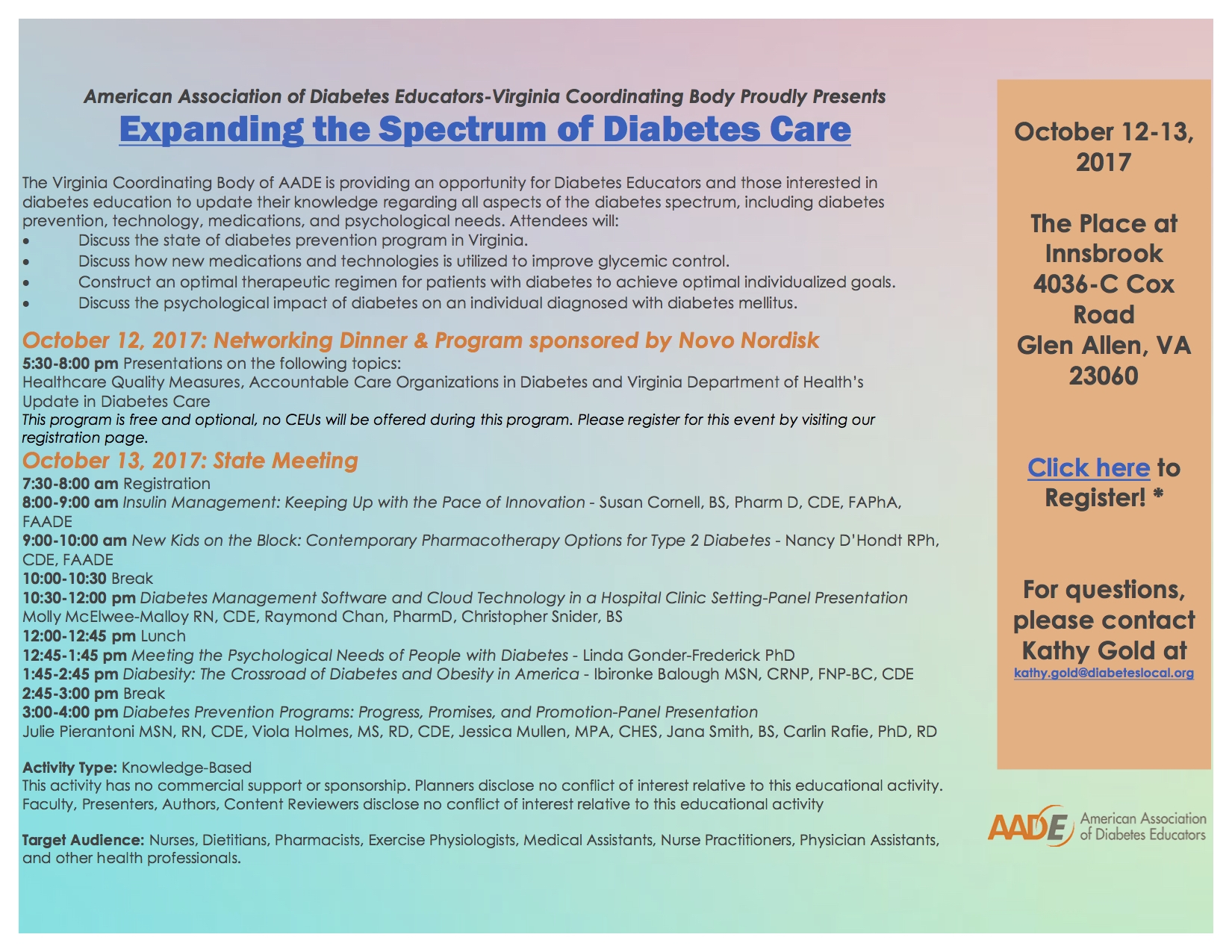 The Virginia Coordinating Body of AADE invites you to join us for our annual state meeting Expanding the Spectrum on Diabetes Care on October 12-13, 2017!
